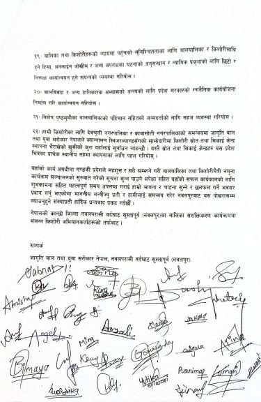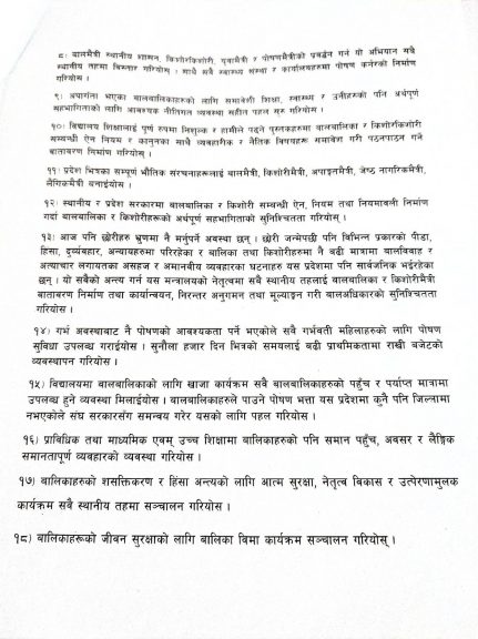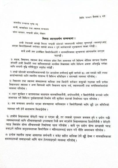 किशोरीहरुले कार्यक्रममा मन्त्री गुरुङ्गलाई २५ बुँदे ध्यानाकर्षण पत्र हस्तान्तरण गरेका हुन् । ध्यानाकर्षण पत्रमा विशेषगरी बालिकाहरुको लागि आवश्यक पर्ने सुरक्षा, पोषण, शिक्षा, सहभागिता, स्वास्थ्य लगायतका विषयहरुको बारेमा स्वयम् किशोरीहरुले नै तयार गरेर हस्तान्तरण गरिएको किशोरी अभियन्ता दृष्टी गिरीले बताउनुभयो । किशोरीहरुले सोमबार मुख्यमन्त्री खगराज अधिकारीलाई पनि ध्यानाकर्षण पत्र हस्तान्तरण गरेका थिए ।