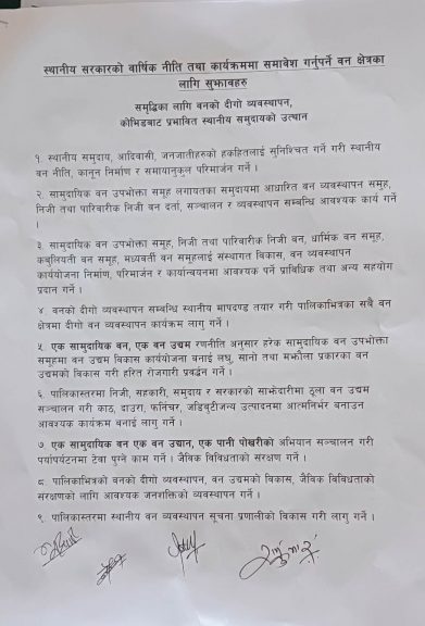 त्यसैगरी ज्ञापन पत्रमा स्थानीय सरकारको बार्षिक नीति तथा कार्यक्रममा समावेश गर्नु पर्ने वन क्षेत्रका लागि सुझावहरु समेत पेश गरिएको थियो । समृद्धिका लागि वनको दीगो व्यवस्थापन, कोभिटबाट प्रभावित स्थानीय समुदायको उत्थान, स्थानीय समुदाय, आदिवासी जनजातिहरुको हकहितलाई सुनिश्चित गर्ने गरी स्थानीय वन नीति, कानुन निर्माण्ण र समायानुकुल परिमार्जन गर्न सुभाव पेश गरेका थियो ।
