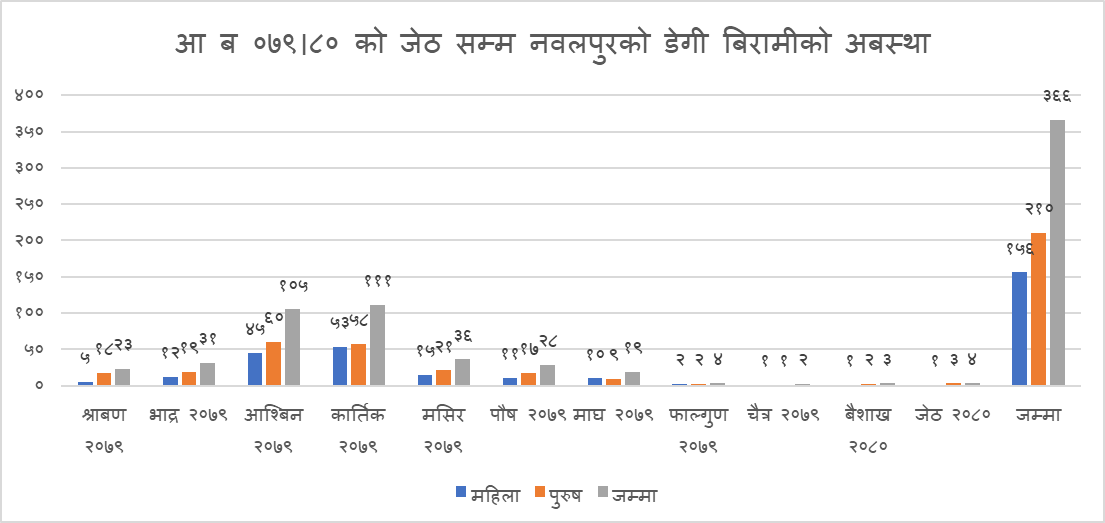 नवलपुरमा आर्थिक बर्ष २०७९।०८० को बैशाखदेखि फाल्गुन गरी ११ महिनामा १ सय ५६ जना महिला र २ सय १० जना पुरुष गरी ३ सय ६६ जनामा डेंगी रोग देखा परेको हो । जस मध्ये असोजमा १ सय ५ जना र कात्तिकमा १ सय ११ जनामा डेंगी रोग देखा परेको स्वास्थ्य कार्यालय नवलुरका प्रमुख चापागाईले बताए ।