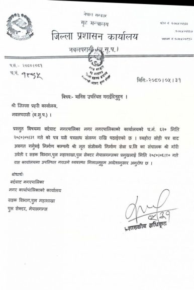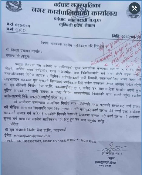 नगरपालिकाले पत्रनै काटेर ठेकेदार कम्पनीलाई सम्पर्कमा ल्याई आवश्यक छलफलको वातावरण मिलाईदिन भन्दै प्रशासनलाई पत्र काटेको हो ।