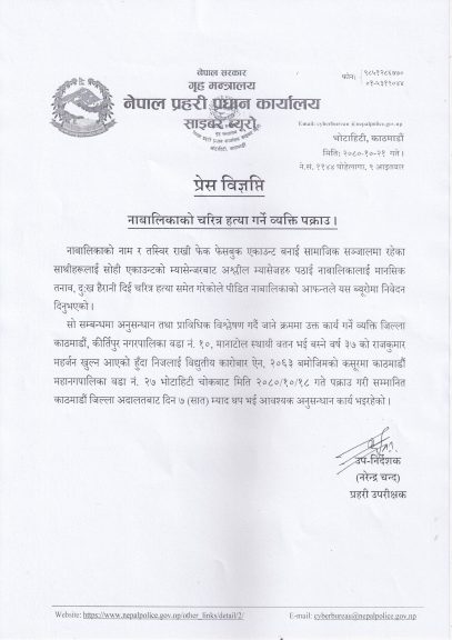 नाबालिकाको नाम र तस्बिर राखी नक्कली फेसबुक अकाउन्ट बनाई चरित्र हत्या गरेको अभियोगमा नेपाल प्रहरीको साइबर ब्युरोले एक ३७ वर्षीय पुरुषलाई पक्राउ गरेको छ।