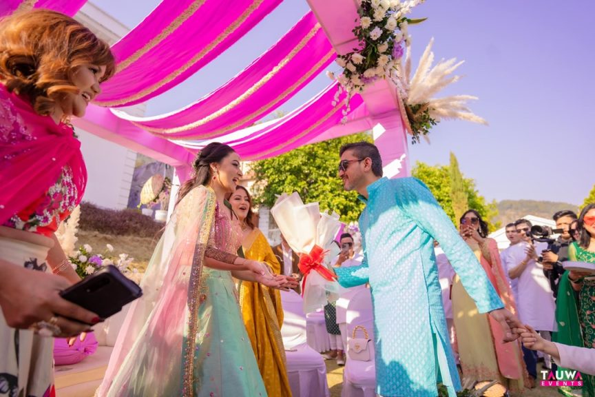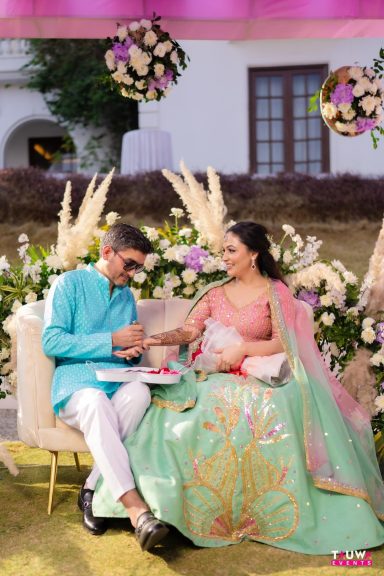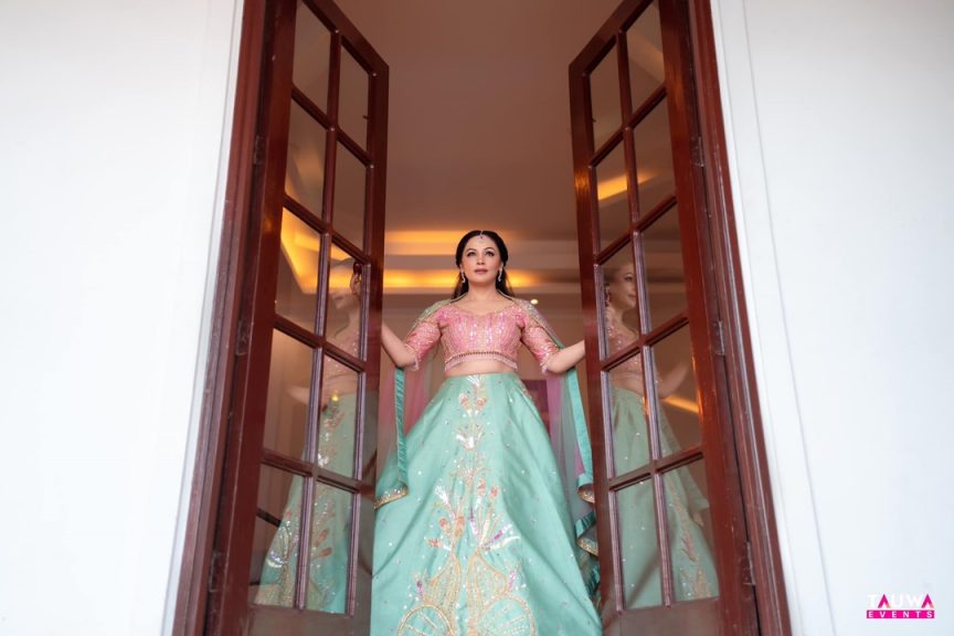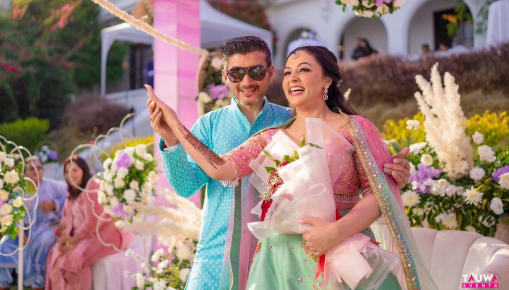 मेहेन्दी समारोहमा नन्दिता गुलाबी रंगको लेहंगामा देखिएकी छन्।
