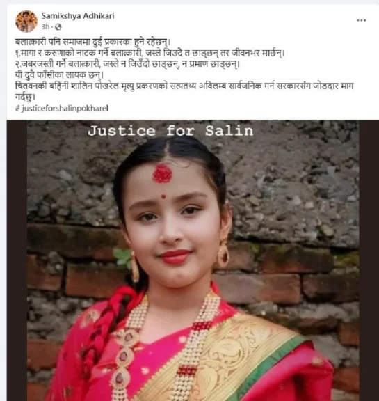 काठमाडौँ । गायिका समीक्षा अधिकारीले होस्टलमा मृत फेला परेकी १४ वर्षीया छात्रा शालिन पोखरेलको न्यायका लागि माग गरेकी छन् ।