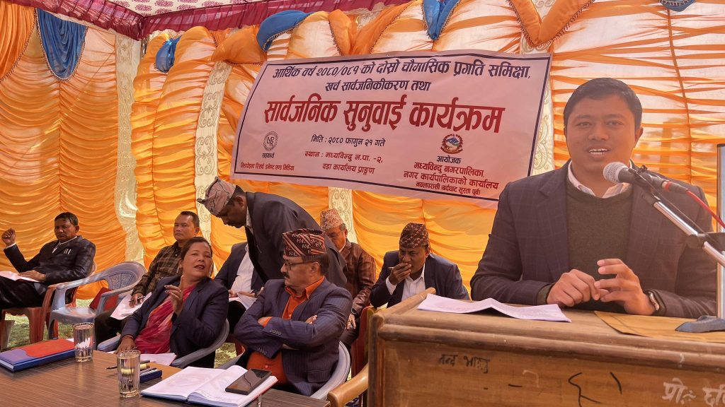 सार्वजनिक सुनुवाई कार्यक्रममा प्रमुख प्रशासकीय अधिकृत रमेश घर्ती चालु आर्थिक वर्ष २०८०/०८१ को दोस्रो चौमासिकको फागुन १५ गते सम्मको प्रगति समिक्षा तथा खर्चको सार्वजनिकीकरण गर्नुभयो । घर्तीले प्रस्तुत गर्नु भएको प्रगति समिक्षाबारे प्रश्न गर्दै सहभागी सुवासचन्द्र नेपाल, बेद प्रसाद भण्डारीले पुँजीगत तर्फ जम्मा २२ प्रतिशत मात्रै खर्च हुन निराशजनक रहेको भन्दै पुँजीगत खर्च बृद्धिको लागि नगरपालिकाको योजना के छ भन्ने प्रश्न गर्नुभयो । सार्वजनिक सुनुवाई सहभागीहरु नेत्र भण्डारी, याम नारायण चौधरी, शिवजी थापा लगायतले आलोक चक्रथप, खानेपानी व्यवस्थापन, फोहर संकलन, हरित नगर, दाहासंस्कार स्थल, नगर चक्रपथ, राशायनिक मल, अनुदानको बिउ, खेलकुद प्रतियोगता, स्वास्थ्य चौकीबाट उपलब्ध हुने निशुल्क औषधी, टोल बिकास संस्थाको संस्थागत विकासका बारे प्रश्न गरेका थिए ।