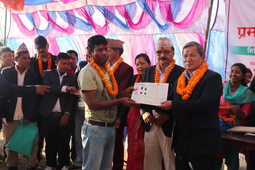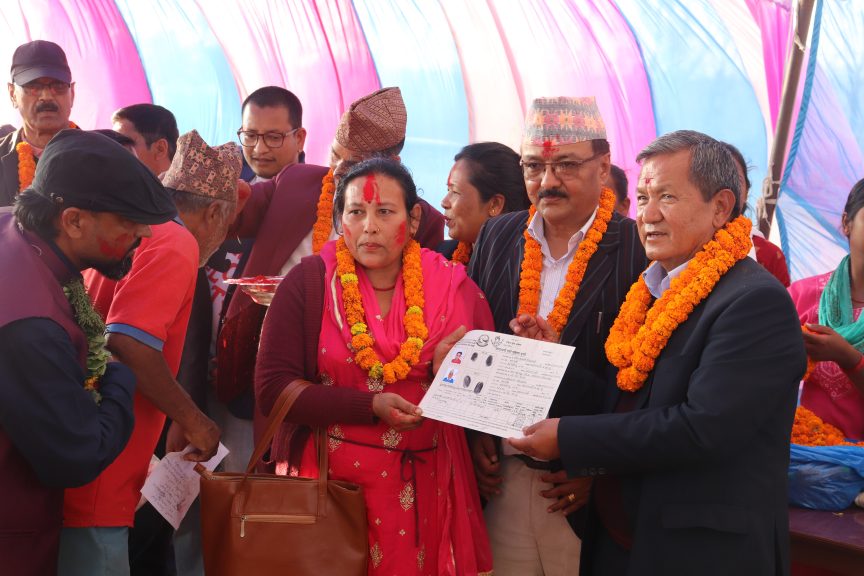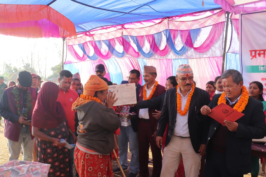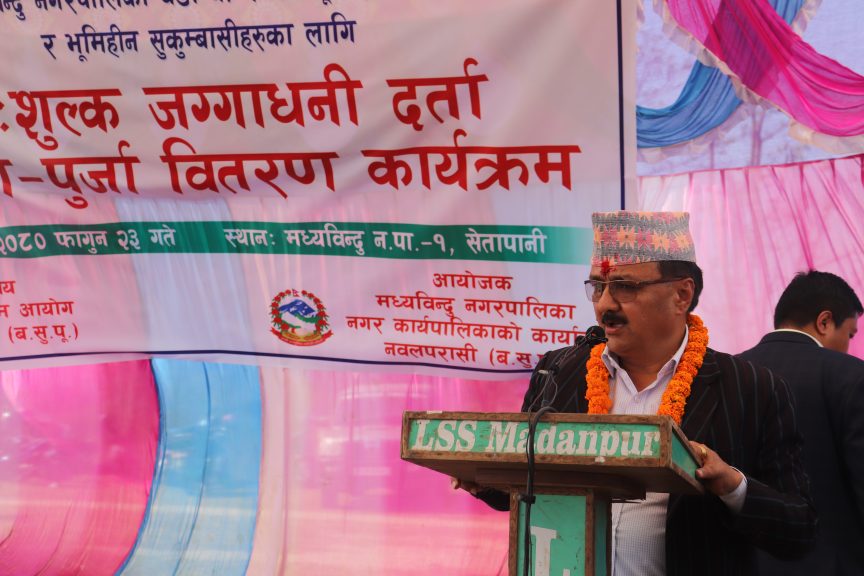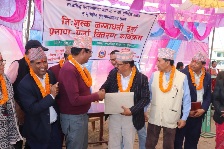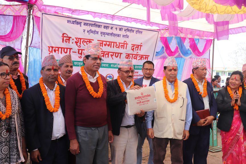 मध्यविन्दु नगरपालिकाद्वारा ९० घर सुकुम्बासीलाई निशुल्क जग्गाधनि लालपूर्जा वितरण