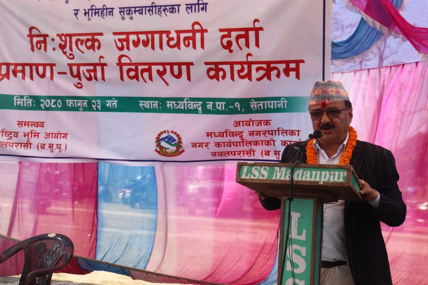 नवलपरासी । पूर्वी नवलपरासीको मध्यविन्दु नगरपालिकाले मध्यविन्दु १ सेतापानीमा रहेका ९० घर सुकुम्बासीहरुलाई आज निशुल्क जग्गाधनी लालपूर्जा वितरण गरेको छ ।