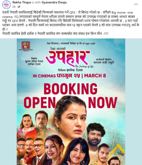 आफ्नो फिल्म ‘उपहार’लाई कम शो उपलब्ध गराएको भन्दै निर्मात्री तथा अभिनेत्री रेखा थापाले क्रुद्ध प्रतिक्रिया जनाएकी छन् । उनले लेखेकी छन्, ‘यसरी नेपाली चलचित्रलाई विदेशी फिल्मको वकालत गर्ने क्यूएफएक्सले विभेद गरेको छ । सँगैको बिग मुभिज, वान सिनेमा र एफक्युब लगायतका हलले सम्पूर्ण नेपालभरि सम्मानजनक शो उपलब्ध गराएको छ । त्यसमा आभार व्यक्त गर्दछु । क्यूएफएक्स चेनले नेपाली फिल्मलाई विभेद गरी विदेशी सिनेमाको भरणपोषण गरेकोमा आपत्ति छ । तीनवटा पर्दा भएका अन्य हलले चार शो दिन सक्ने तर काठमाडौंमा मात्र १३ स्क्रिन भएको चेनले तीन शो मात्र उपलब्ध गराउनुको अर्थ के हो ? नेपाली चलचित्रप्रेमी दर्शक र नेपाली चलचित्रसँग सम्बन्धित संघसस्थाहरु किन मौन ?’