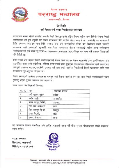 बिहीबार एक विज्ञप्ति जारी गर्दै परराष्ट्र मन्त्रालयले रूसी सेनामा कार्यरत सात नेपालीको मृत्यु भएको पुष्टि गरेको हो।