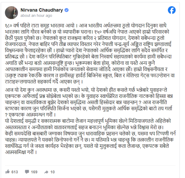 ‘आज राजनीति स्टन्टका कारण जुन परिस्थिति सिर्जना भएको छ, यसैगरी मुलुकले आर्थिक समृद्धिको बाटो तय गर्ला ? एकपटक आत्म–मन्थन गरौं,’ निर्वाणले फेसबुकमा लेखेका छन् । चौधरी ग्रूपका प्रवन्ध निर्देशकसमेत रहेका निर्वाणले देशलाई समृद्धि र सकारात्मक बाटोमा लैजान महत्वपूर्ण भूमिका खेल्ने मिडिया जगतले अहिलेको अस्तव्यस्तता र अन्यौलताको वातावरणलाई सहज बनाउन भूमिका खेल्ने विश्वास पनि लिएका छन् ।
