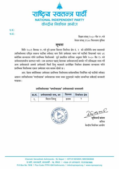 काठमाडौँ । राष्ट्रिय स्वतन्त्र पार्टी (रास्वपा)ले इलाम २ मा हुने उपनिर्वाचनमा मिलन लिम्बूलाई उम्मेदवार बनाएको छ ।