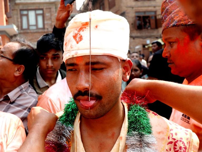 दिउँसो २ बजे बासको चिम्टी बजाउँदै एकहुल मानिसहरु हातको साङ्लो बनाएर जिब्रो छेड्ने पाँचो गणेश मन्दिर क्षेत्रमा आएपछि सबैको ध्यान त्यतै केन्द्रित भयो । बीचमा जिब्रो छेड्न तयार भएका २८ वर्षीय सुजन वाग श्रेष्ठ बोडेका सबै देवीदेवताको मन्दिरमा पुगेर पुजा गर्दै आइपुगे ।