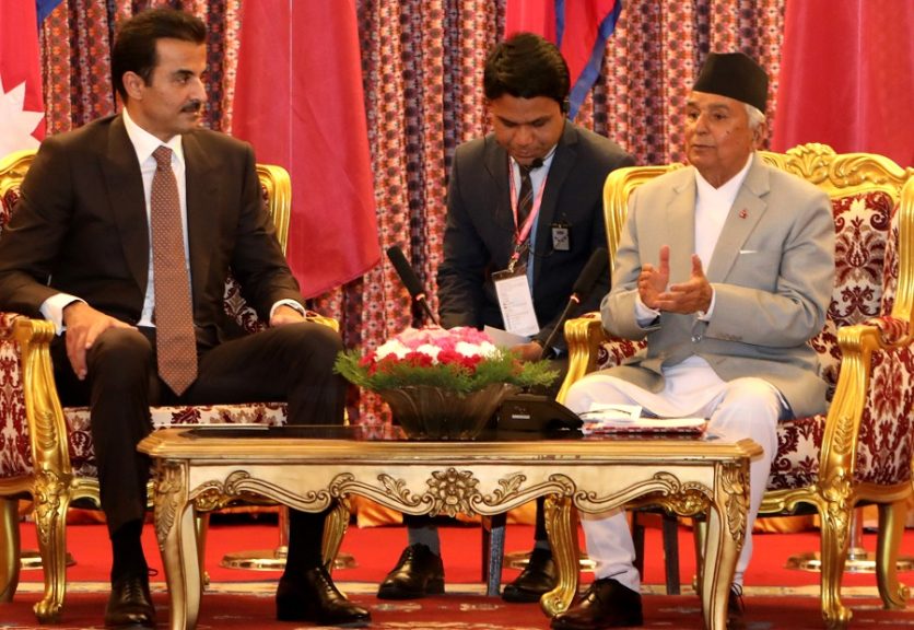 कतारका अमिर (राजा) शेख तमिम बिन हमाद अल थानी दुई दिने नेपाल भ्रमणका क्रममा काठमाण्डौ आइपुग्नुभएको छ । कतारका अमिर थानी दिउँसो पौने ४ बजेतिर विशेष विमानमार्फत त्रिभुवन अन्तर्राष्ट्रिय विमानस्थलमा ओर्लिनुभएको हो । विमानस्थलमा उहाँलाई राष्ट्रपति रामचन्द्र पौडेलले स्वागत गर्नुभएको छ ।
