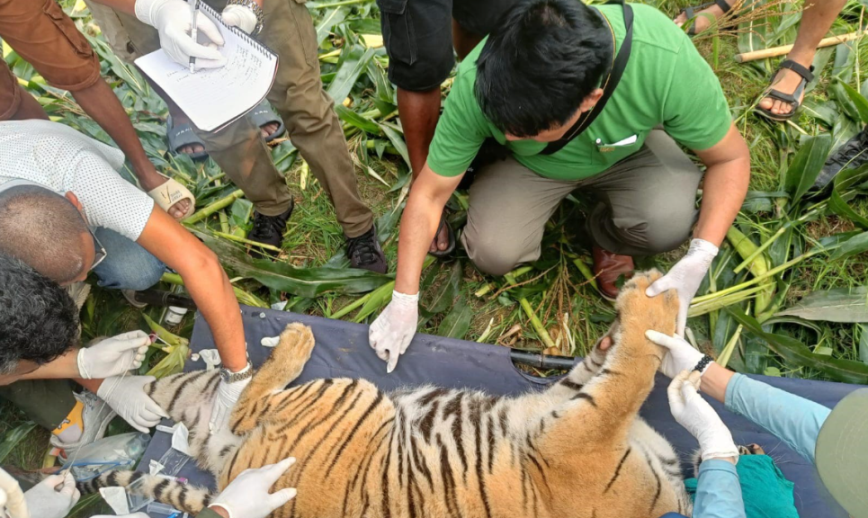 चितवन राष्ट्रिय निकुञ्जबाट खटिएको बाघ नियन्त्रक प्राविधिकहरूको टोलीले बाघलाइ पछ्याउदै जादा मकैबारीमा लुकेको अवस्थामा राती बाघलाई डार्ट गरी नियन्त्रणमा लिइएको हो ।