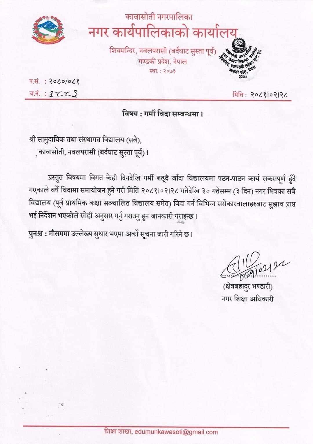 कावासोती नगरपालिकाले आज सूचना जारी गरी गर्मीका कारण पठनपाठनमा सकस भएको भन्दै कावासोती नगरपालिका भित्रका सामुदायिक र संस्थागत विद्यालय आजदेखि ३ दिनलाई विदा गरिएको जनाएको छ ।