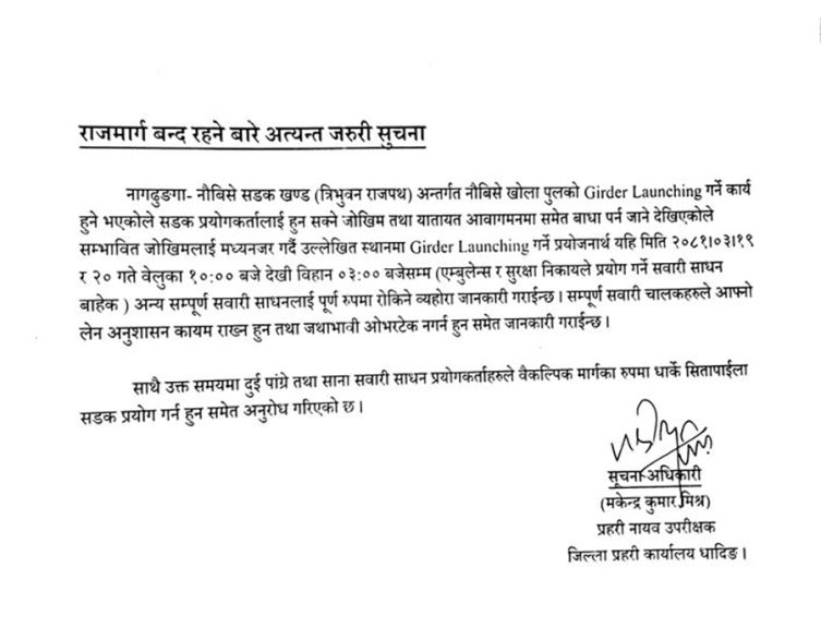 नौबिसे खोला पुलमा काम गर्न सहजीकरणका लागि १९ र २० असारका दिन राति १० बजेदेखि बिहान ३ बजेसम्म यो सडक बन्द गर्न लागिएको धादिङ प्रहरीले जानकारी गराएको छ ।