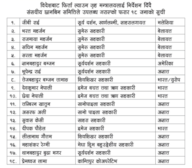 त्यस्तै सुमेरु सहकारीका भरत महर्जन, राजमाया महर्जन, सचिन महर्जन र सरला महर्जनको नाम पनि सूचीमा छ । सूर्यदर्शन सहकारीका पूर्वअध्यक्ष ज्ञानबहादुर बम्जन, थानबहादुर बुढा मगर, शिवशिखर सहकारीका भूपेन्द्र राई, तेजबहादुर बम्जन तामाङ र लीलानाथ गौतम, इमेज सहकारीका देवकुमार नेपाली, क्षेदा नेपाली र दीपक पौडेल, सानो पाइलाका तस्बिरन खातुन र असरफ अली, साहरा बचत तथा ऋण सहकारीका सुवास केसी, कान्तिपुर सहकारीका प्रेमध्वज लामा, मेगाड्रिम सहकारीका महाशंकर रेग्मी गरी १८ जनालाई विदेशबाट खोजेर ल्याउने संसदीय समितिले भनेको हो ।