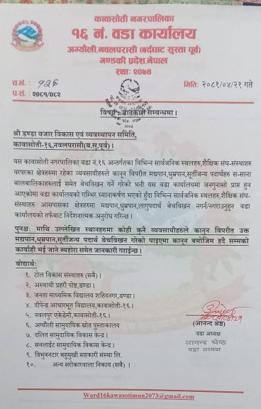 कावासोती नगरपालिकाको १६ नम्बर वडा कार्यालयले आज एक सूचना जारी गरी यस्तो प्रतिबन्ध लगाएको हो ।