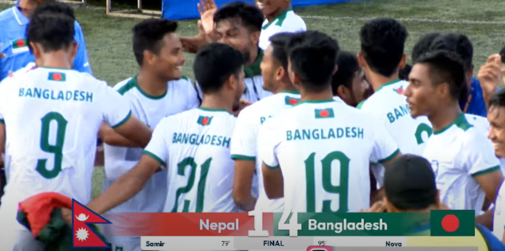 बुधबार सातदोबाटोस्थित एन्फा कम्प्लेक्समा बङ्गलादेशलाई जित दिलाउन मिराजुली इस्लामले दुई गोल गरे। अर्को गोल मोहम्मद रब्बी हुसेन राहुल र पियास अहमद नोभाले गरे। नेपालका समिर तामाङले एक गोल फर्काए।