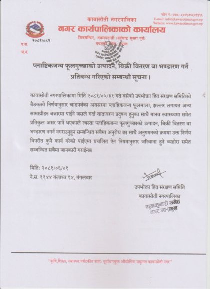 त्यसैगरी नवलपुरको देवचुली नगरपालिकाले प्लाष्टिकजन्य फूलगुच्छा तथा मालाको प्रयोग नगर्न अनुरोध गरेको छ ।
