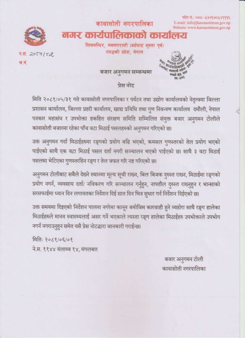 त्यसैगरी ३ वटा मिठाइ पसलमा अखाद्य वस्तु रङ्ग र दुषित तेल प्रयोग गरेको पाइएकोले नष्ट गरेको समेत जनाएको छ ।