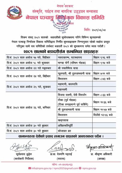 असोज १८ गते झण्डा फेर्ने साइत छ । यस दिन बिहान ९ बजेर १४ मिनेटमा पश्चिम फर्किएर झण्डा फेर्नुपर्ने समितिले जनाएको छ ।