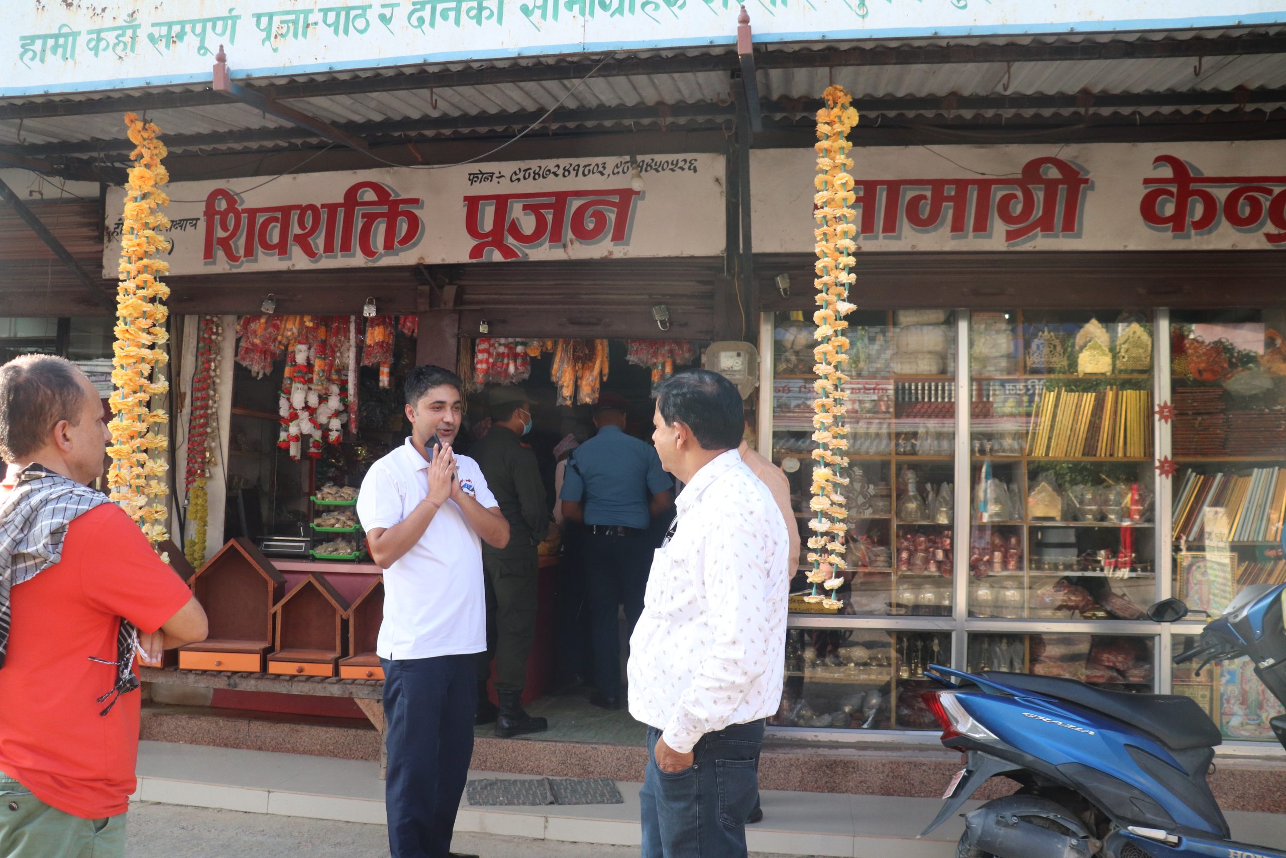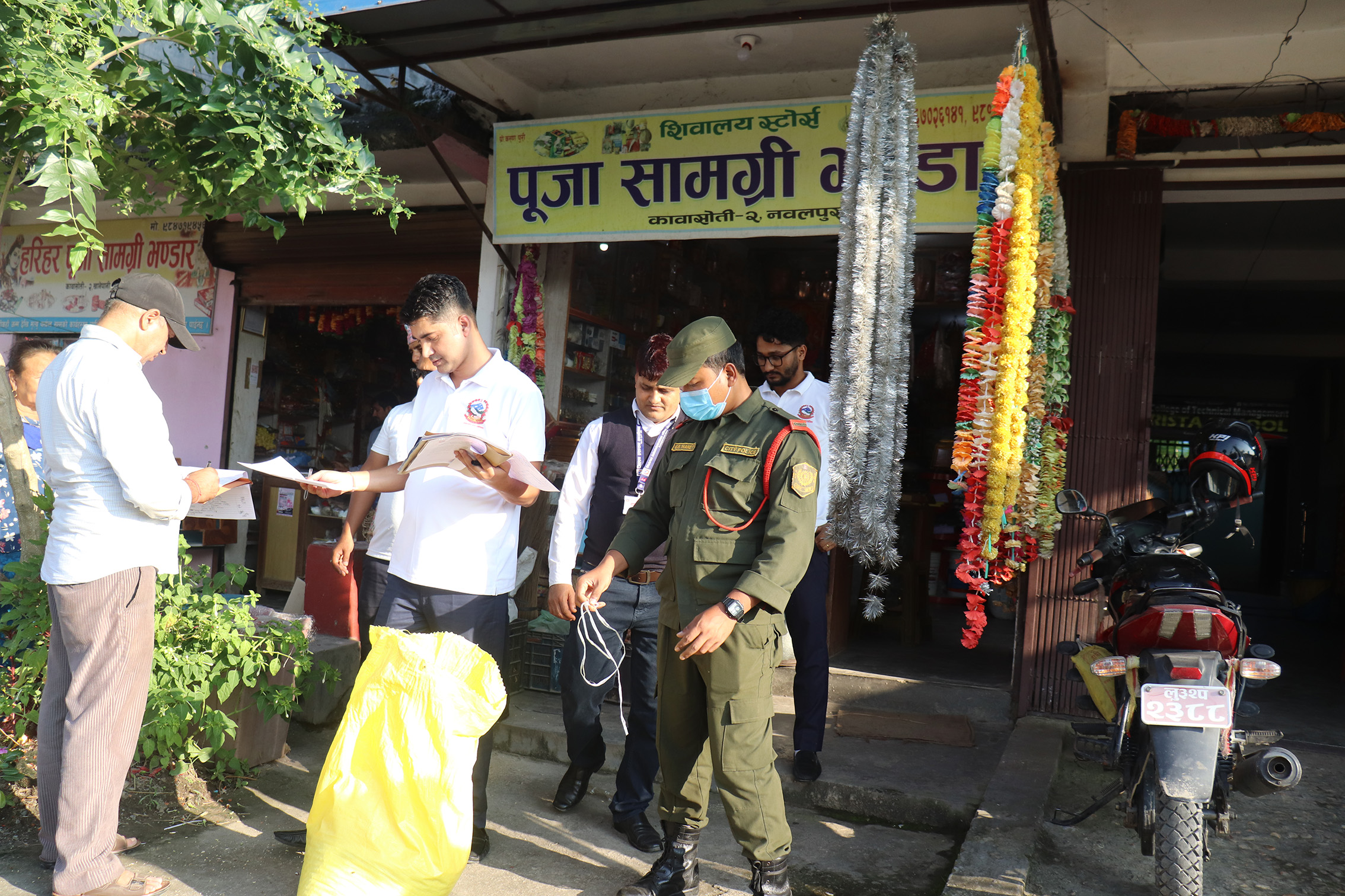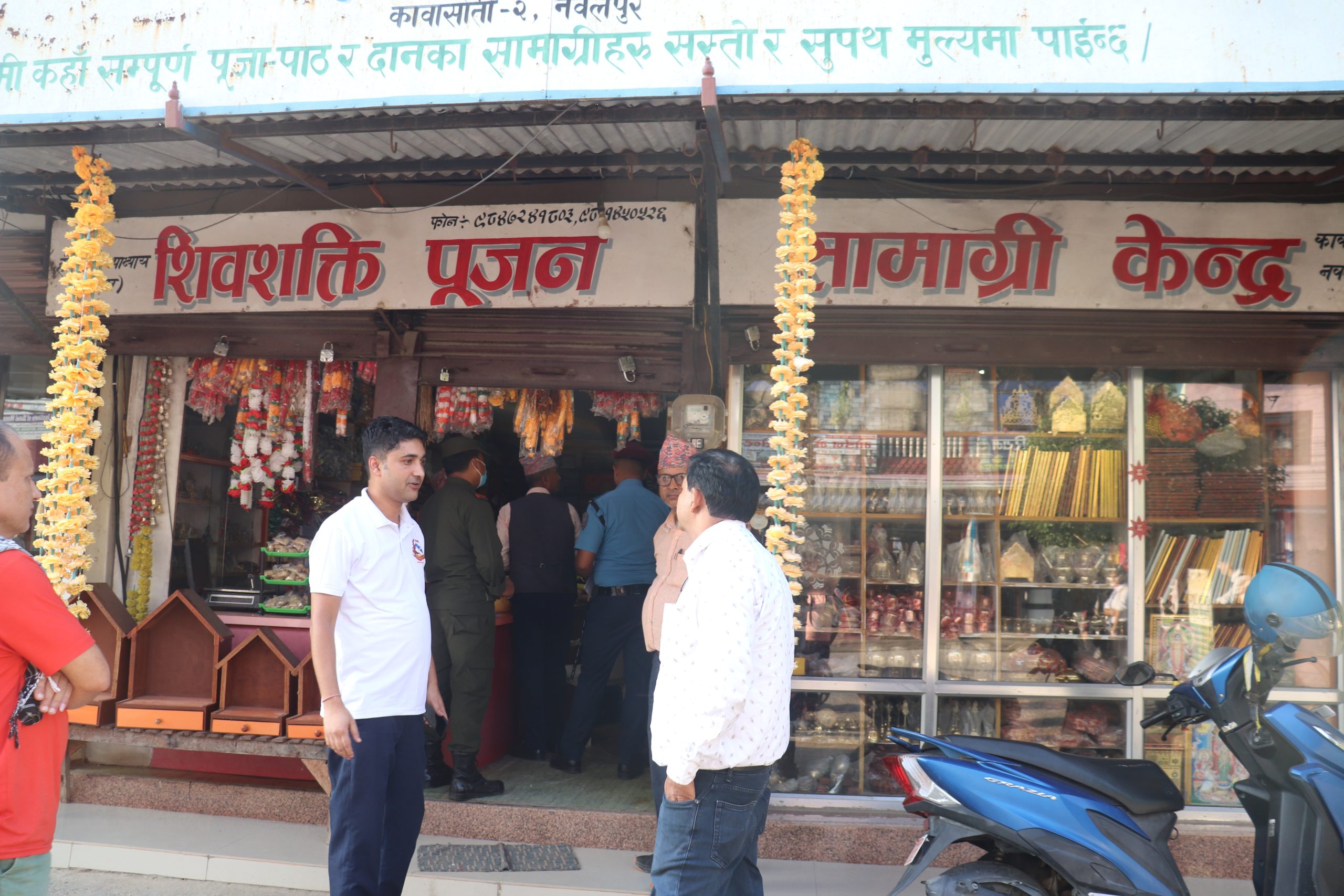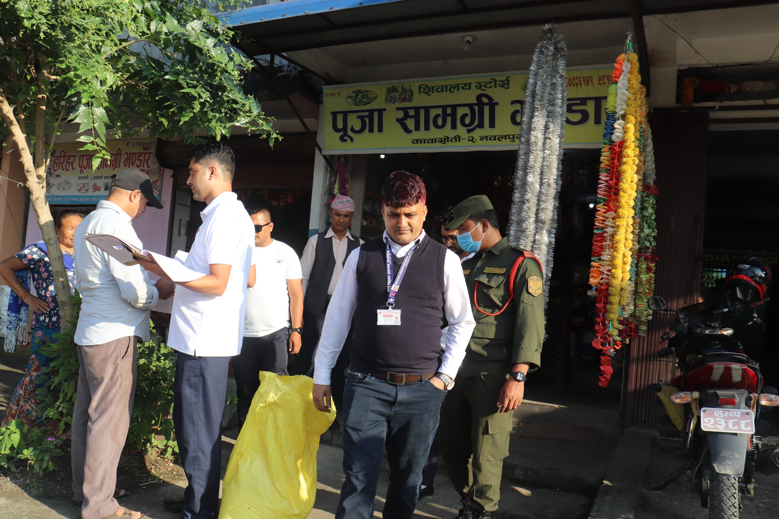 प्लाष्टिकका फूलमाला रोक्न कावासोतीका पूजा सामग्री पसलमा अनुगमन
