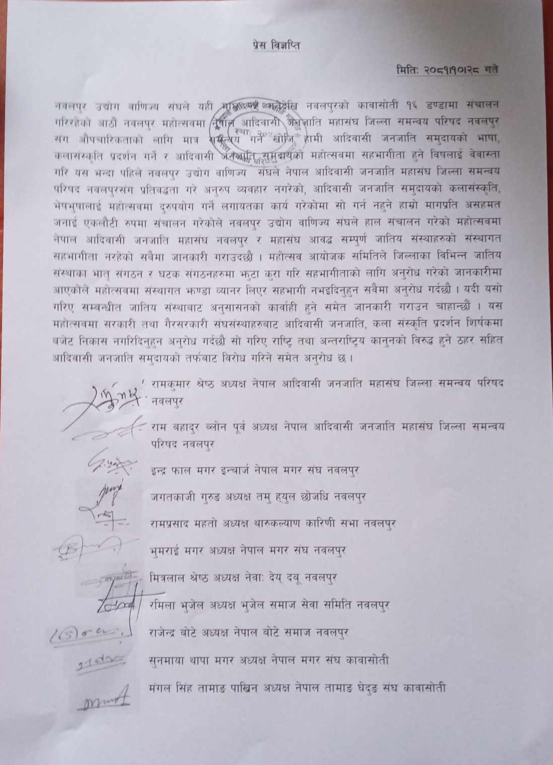 विज्ञप्तिमा नेपाल आदिवासी जनजाति महासंघ नवलपुरका अध्यक्ष रामकुमार श्रेष्ठ, पूर्व जिल्ला अध्यक्ष रामबहाादुर ब्लोन, नेपाल मगर संघ नवलपुरका इन्चार्ज इन्द्रफाल मगर, जिल्ला अध्यक्ष भुमराई मगर, कावासोती नगर अध्यक्ष सुनमाया थापा मगर, तमु ह्युल छोजधि गुरुङ राष्ट्रिय परिषद नवलपुरका अध्यक्ष जगतकाजी गुरुङ, नेवा देय दबू नवलपुरका अध्यक्ष मित्रलाल श्रेष्ठ, भुजेल समाज सेवा समिति नवलपुरका अध्यक्ष रमिला भुजेल, नेपाल बोटे समाज नवलपुरका अध्यक्ष राजेन्द्र बोटे, नेपाल तामाङ घेदुङ संघ कावासोतीका अध्यक्ष मंगल सिंह तामाङ लगायतको हस्ताक्षर गरेका छन् ।