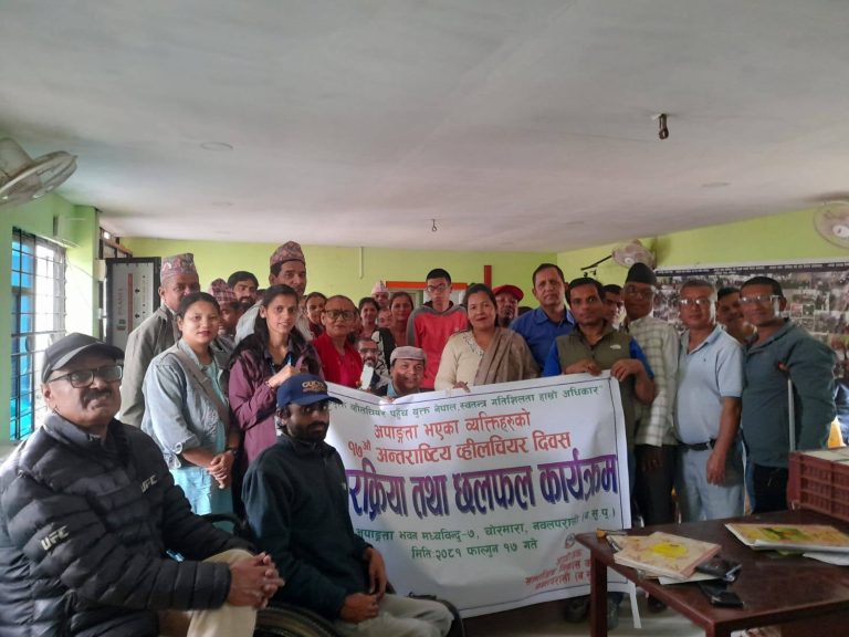 आज शनिबार ‘उपयुक्त ह्वीलचियर पहुँच युक्त नेपाल, स्वतन्त्र गतिशीलता हाम्रो अधिकार’ भन्ने नारा सहत १७ औं अन्तर्राष्ट्रिय ह्वीलचियर दिवसको अवसरमा पारेर नवलपुरको मध्यविन्दुमा छलफल तथा अन्तरक्रिया कार्यक्रममा उनीहरुले माग गरेका हुन् ।