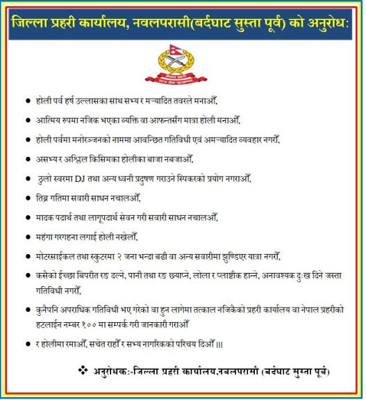 नवलपुर । जिल्ला प्रहरी कार्यालय नवलपुरले एक सूचना प्रकाशन गरी होली पर्व सभ्य र मर्यादित ढंगले मनाउन आग्रह गरेको छ । नवलपुर प्रहरीद्वारा जारी सूचनामा होली पर्व हर्ष उल्लासका साथ सभ्य र मर्यादित तवरले मनाउन, आत्मीय रुपमा नजिक भएका व्यक्ति वा आफन्तसँग मात्रै होली मनाउन अनुरोध गरिएको छ ।