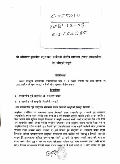 पूर्वराष्ट्रपतिद्वय रामवरण यादव र विद्यादेवी भण्डारीविरुद्ध युवराज सफलले उजुरी दिएका छन्।