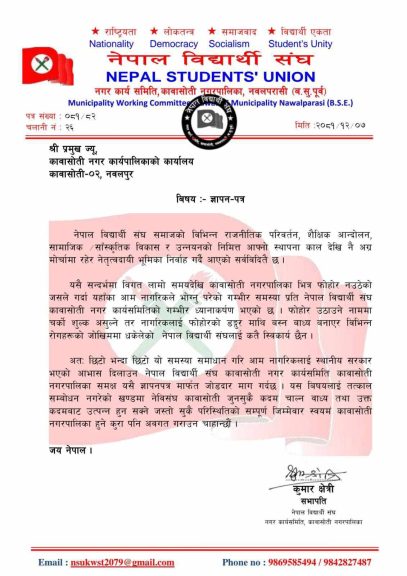 नेविसंघ कावासोतीका सभापति कुमार क्षेत्रीको नेतृत्वमा गएको विद्यार्थीहरुको टोलीले कावासोती नगरपालिकाका नगर प्रमुख विष्णुप्रसाद भुसाल र प्रमुख प्रशासकीय अधिकृत लिलाराज पौडेललाई ज्ञापन पत्र बुझाएका छन् ।