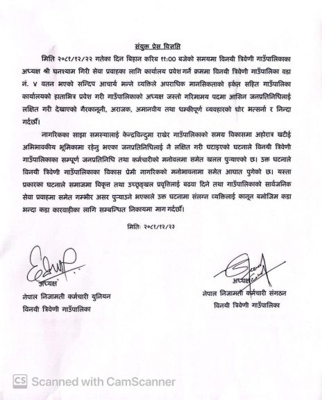 चारदिन देखि फरार रहेका आचार्यलाई कारवाहीको माग गर्दै नेपाल निजामती कर्मचारी युनियन विनयी त्रिवेणी गाउँपालिका र नेपाल निजामती कर्मचारी संगठन विनयी त्रिवेणी गाउँपालिकाले संयुक्त प्रेस विज्ञप्ति जारी गरेका हुन् । गाउँपालिका अध्यक्ष घनश्याम गिरी माथि गत शुक्रबार कार्यालय परिषरमा सन्दिप आर्चायले आक्रमण गरेका थिए ।