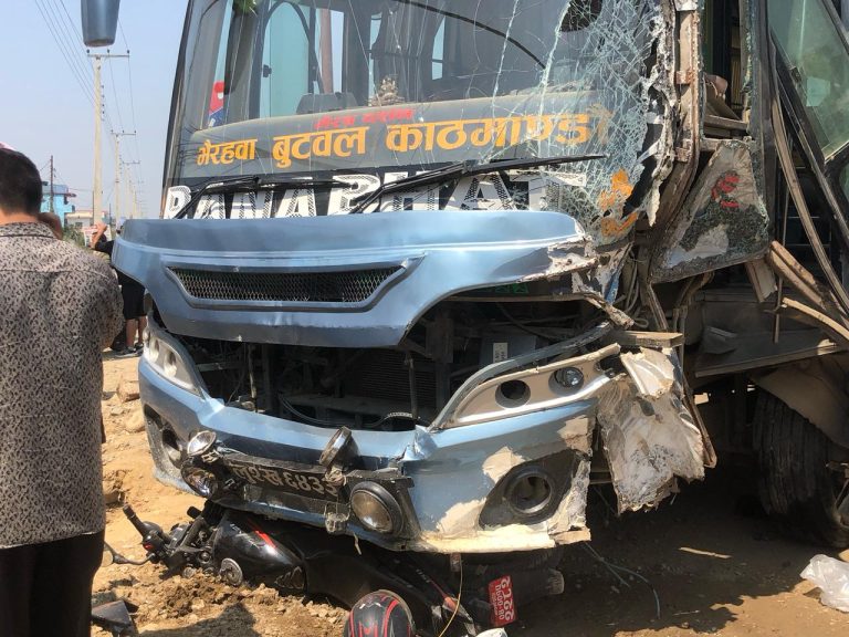 आज विहान पूर्व–पश्चिम राजमार्गमा भैरहवाबाट नारायणगढ तर्फ जाँदै गरेको बा.प्र.०३–००१ ख ३५३४ नं.को ट्रकलाई सोही दिशा तर्फ जाँदै गरेको लु २ ख ६४३३ नं. को बसले ओभरटेक गर्ने क्रममा विपरित दिशाबाट आउँदै गरेको ग.प्र. ०४–००१ प २२८२ नं.को मो.सा. उक्त बसमा ठोक्किन गई दुर्घटना हुँदा ३ जना गम्भीर घाइते भएका हुन् ।