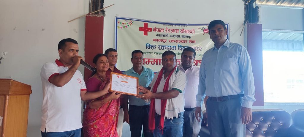 नवलपुर । नेपाल रेडक्रस सोसाइटी कावासोती उपशाखाले शनिबार विश्व रक्तदाता दिवसको अवसर पारेर रक्तदाता संस्थाहरुलाई सम्मान गरेको छ ।