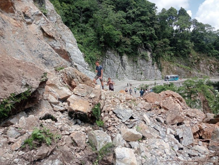 बाटोमा ठूला ठूला ढुंगाको पहिरो खसेको छ ।