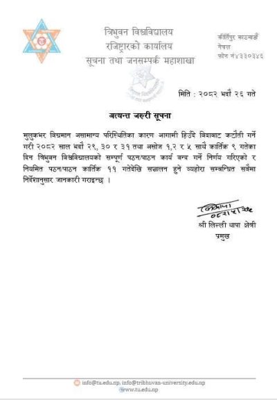 मुलुकभर विद्यमान असामान्य परिस्थितिका कारण हिउँदे बिदामा कटौती गर्नेगरी विश्वविद्यालयले बिदा दिएको विश्वविद्यालय रजिष्ट्रारको कार्यालयका सूचना तथा सम्पर्क महाशाखाका प्रमुख लिल्लीथापा क्षेत्रीद्वारा हस्ताक्षरित सूचनामा उल्लेख छ।