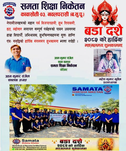 समता शिक्षा निकेतन कावासोतीले दशैं पर्वको उपलक्षमा कक्षा नर्सरी देखी कक्षा १० सम्मका सबै बिद्यार्थीहरूलाई टिका जमरा सहित दक्षिणामा नगद सहित चिट्टा प्रणालीबाट स्कुल ड्रेस, कपी कलम , ज्यामेट्री बक्स, खेलकुद सामाग्रीहरू बितरण गर्दै, शिक्षक अभिभावकहरूसंग शुभकामना साटासाट गर्दै दशै मनाएको छ ।