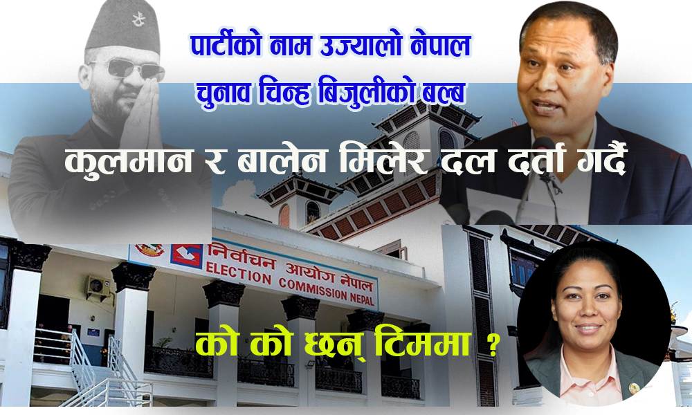 ऊर्जामन्त्री कुलमान घिसिङको नेतृत्वमा नयाँ दल निर्माणको तयारी अन्तिम चरणमा पुगेको छ । पार्टीको नाम ‘उज्यालो नेपाल’ र चुनाव चिन्ह बिजुलीको बल्ब प्रस्ताव गरेर आयोगमा निवेदन दिन लागिएको हो ।