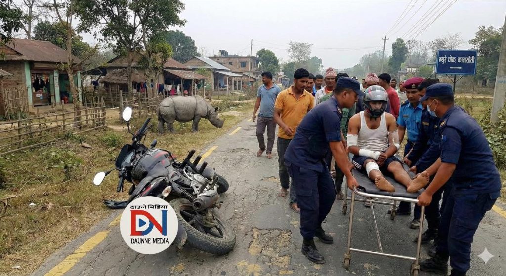 नवलपुर । नवलपुरको कावासोती नगरपालिका–८, न्युरेचोकमा गैँडासँग मोटरसाइकल ठोक्किँदा एक जना घाइते भएका छन्।