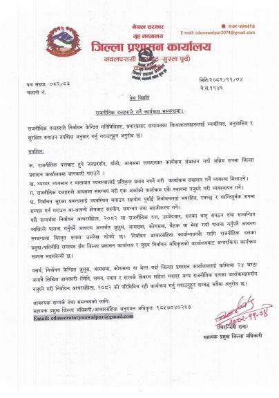 नवलपुर । जिल्ला प्रशासन कार्यालय नवलपुरले नवलपुर जिल्लामा चुनावी वा कुनै पनि राजनीतिक कार्यक्रम गर्दा प्रशासनलाई जानकारी गराएर मात्र गर्न अनुरोध गरेको छ ।