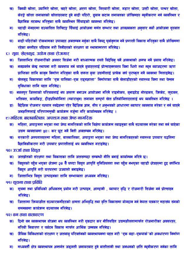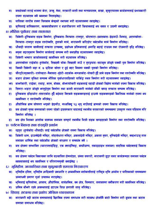 त्यसैगरी बाझोबारी, राईका, रुचाङ, नरम, बोबक, बोझापोखरी सडकलाई पहाडी क्षेत्रको विशेष मार्गका रूपमा विकास गरिने, सिमरा–भडरा जोड्ने झलुङ्गे पुल निर्माण, काली नारायणी मार्गको बाँकी खण्ड तत्काल सम्पन्न गरिने उल्लेख गरिएको छ ।